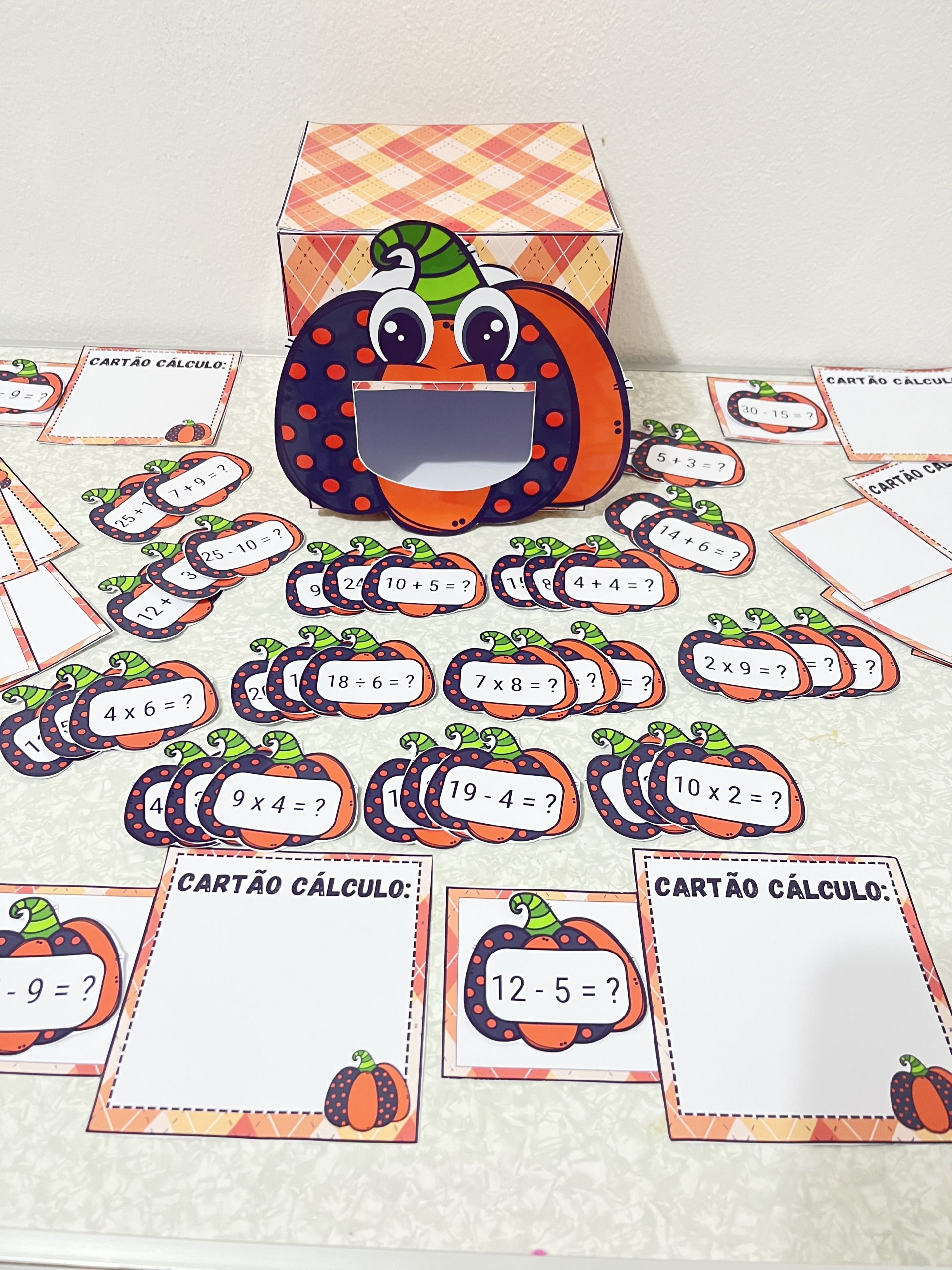 🎃 abra a caixa e retire um card, a criança deve utilizar o cartão cálculo para fazer as operações matemáticas e logo após podem compartilhar o resultado com os colegas.