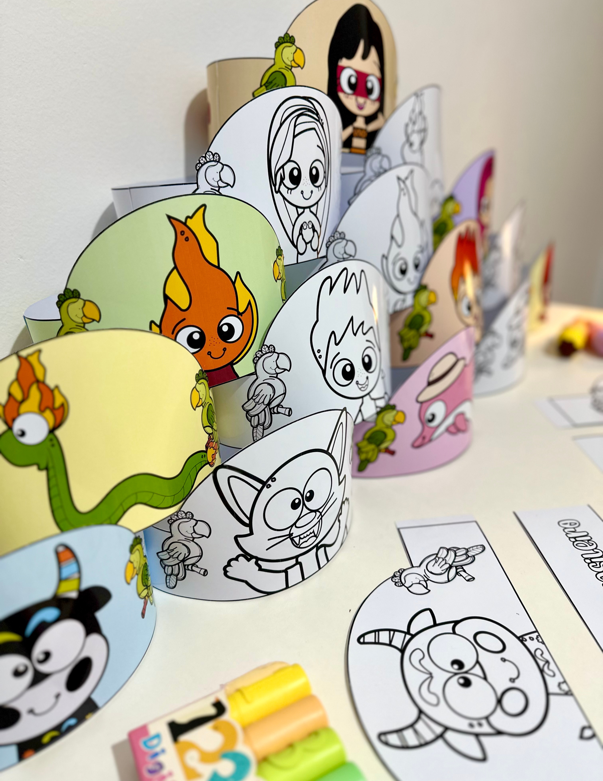 Vai com 9 coroas coloridas e 9 coroas para colorir, e inclui os personagens das principais lendas do Folclore Brasileiro.