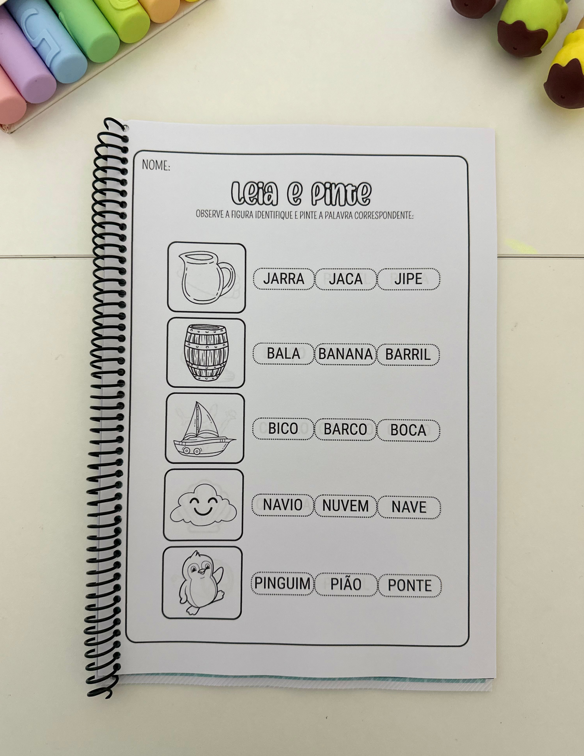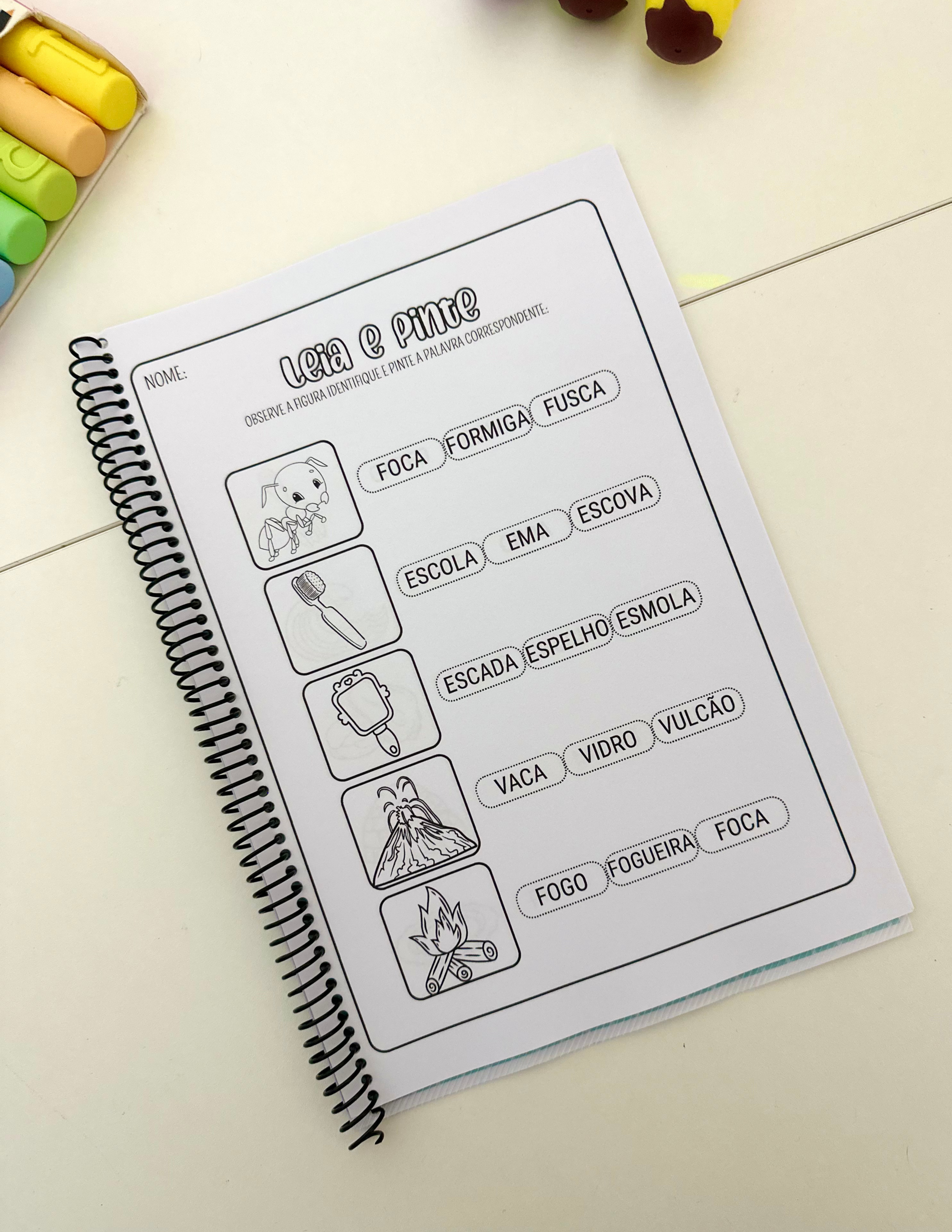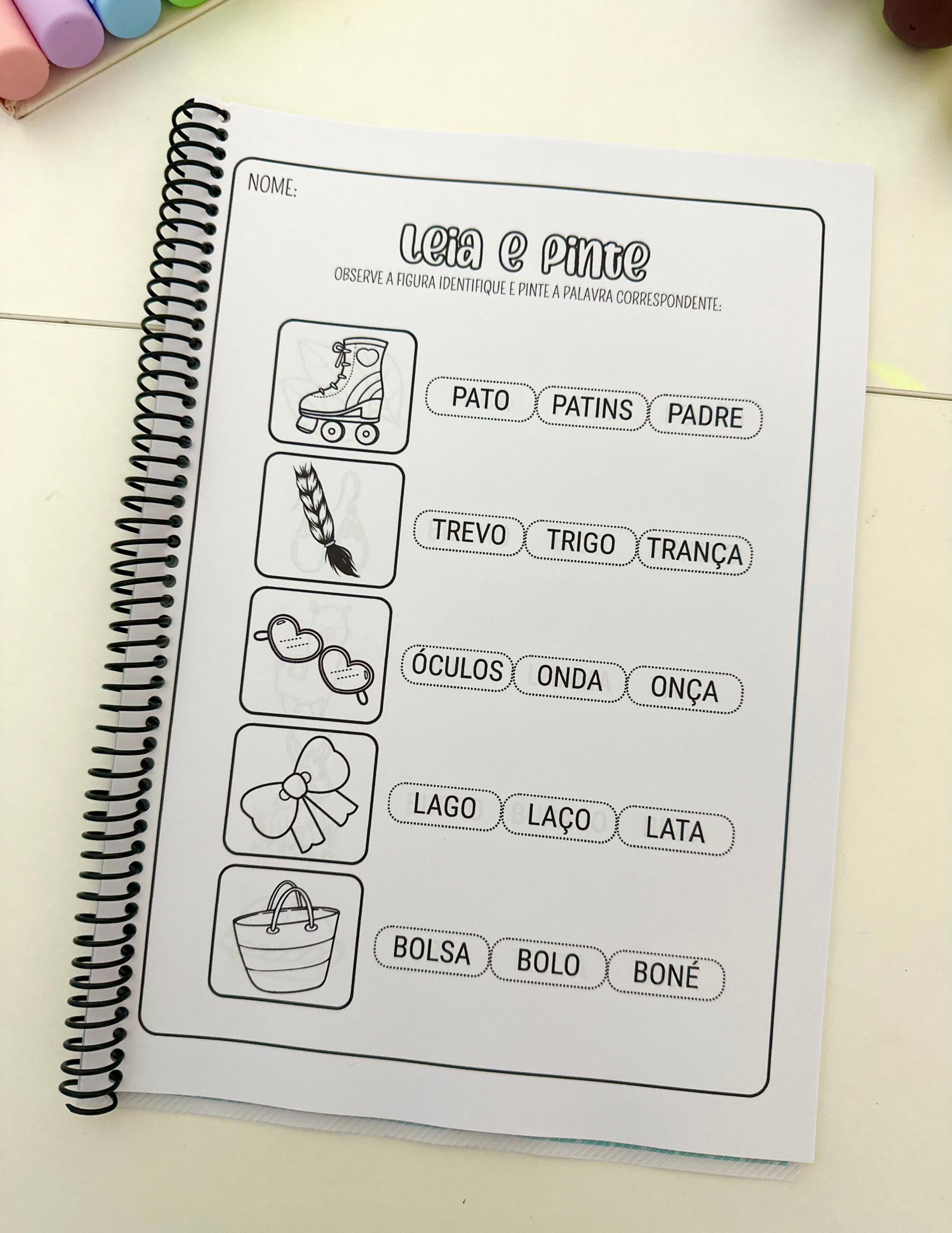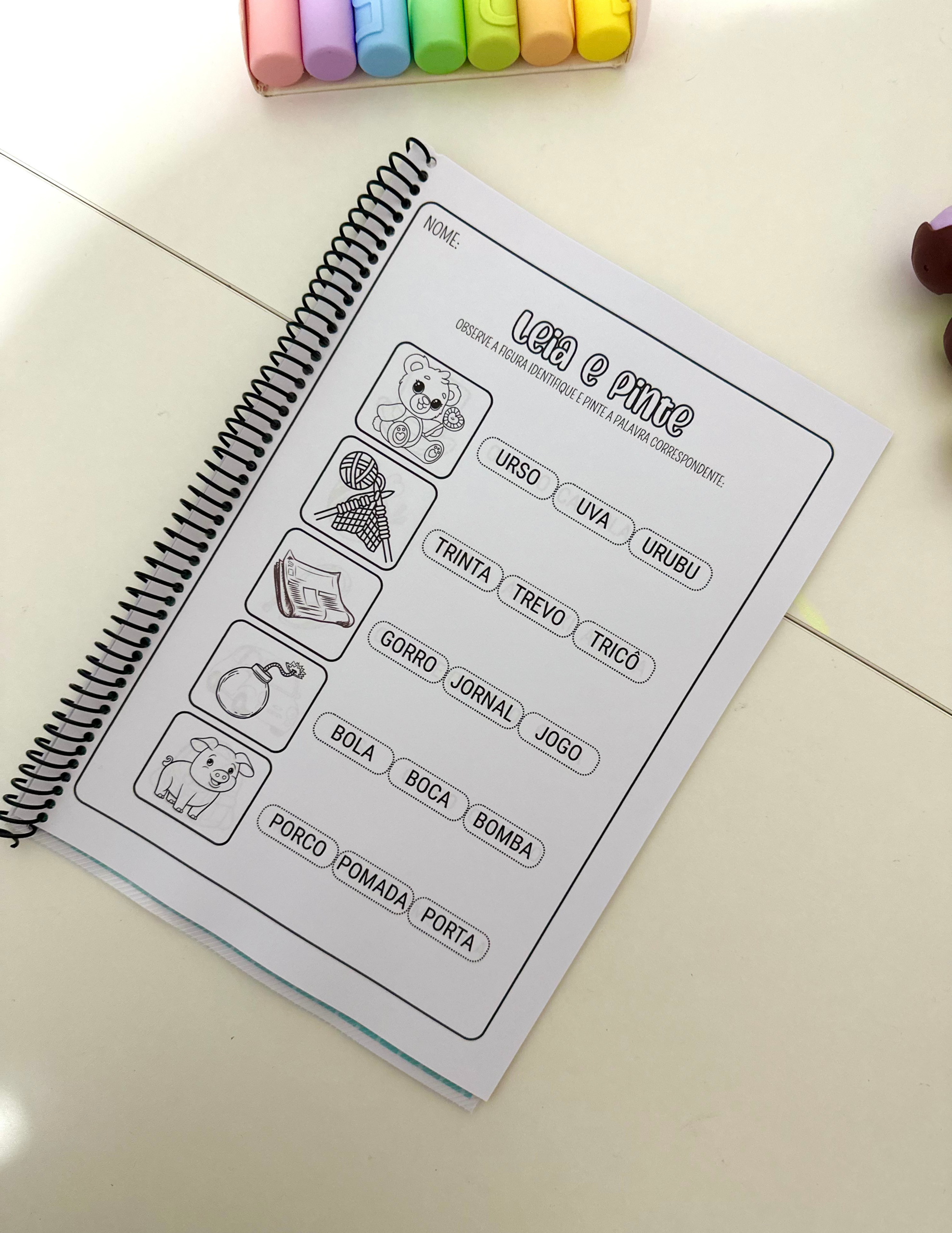 Proposta que estimula a leitura de palavras de sílabas complexas ou com maior nível de dificuldade, além de trabalhar compreensão leitora e pintura.