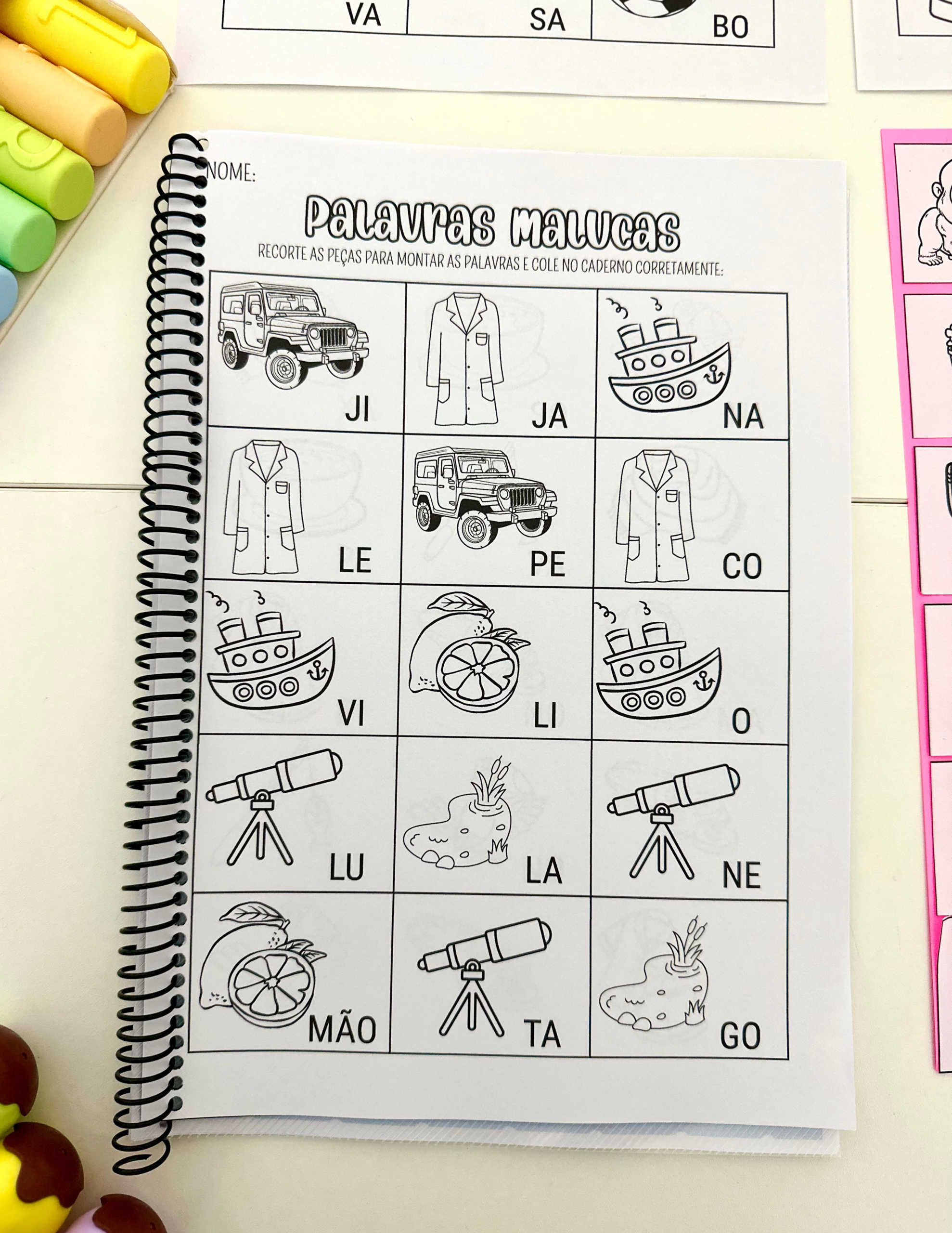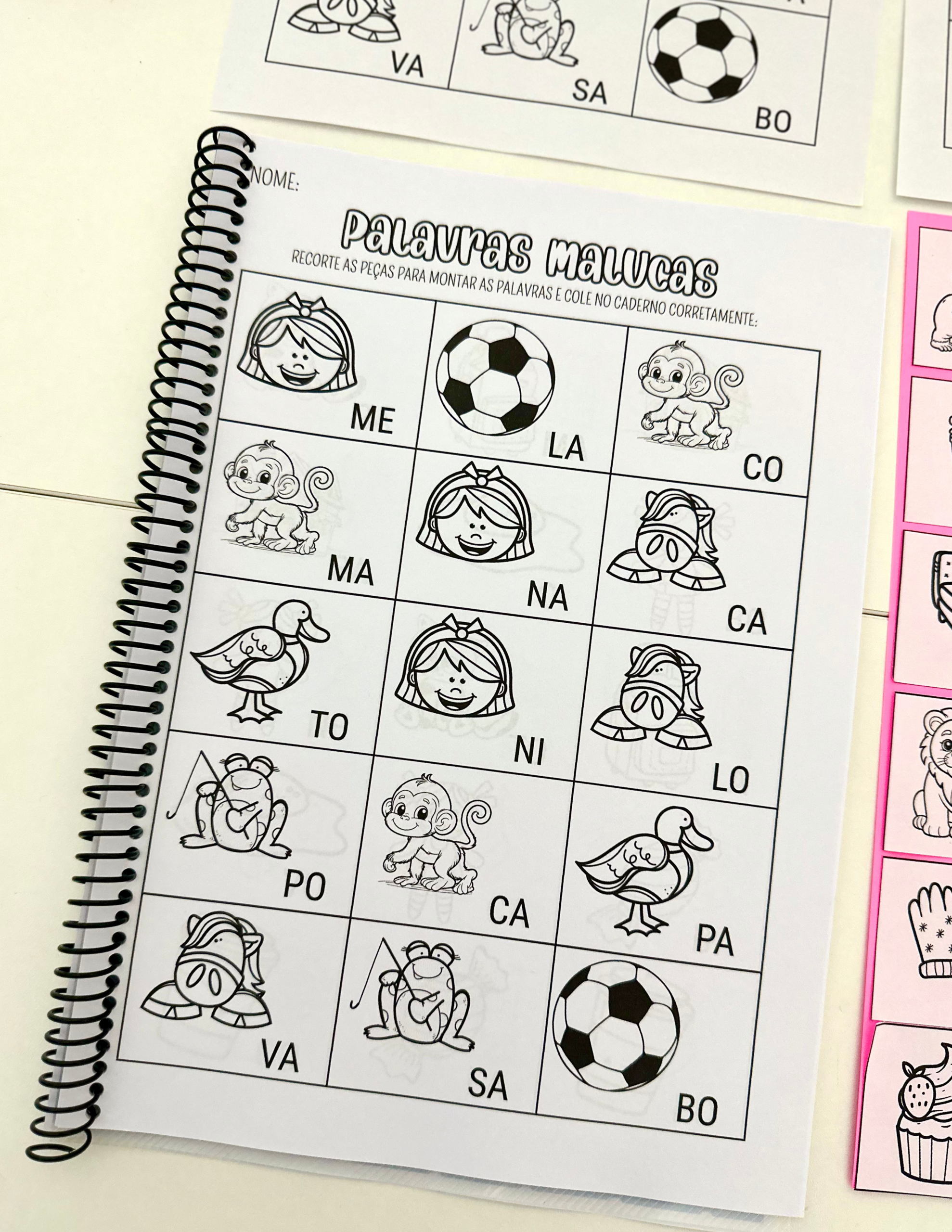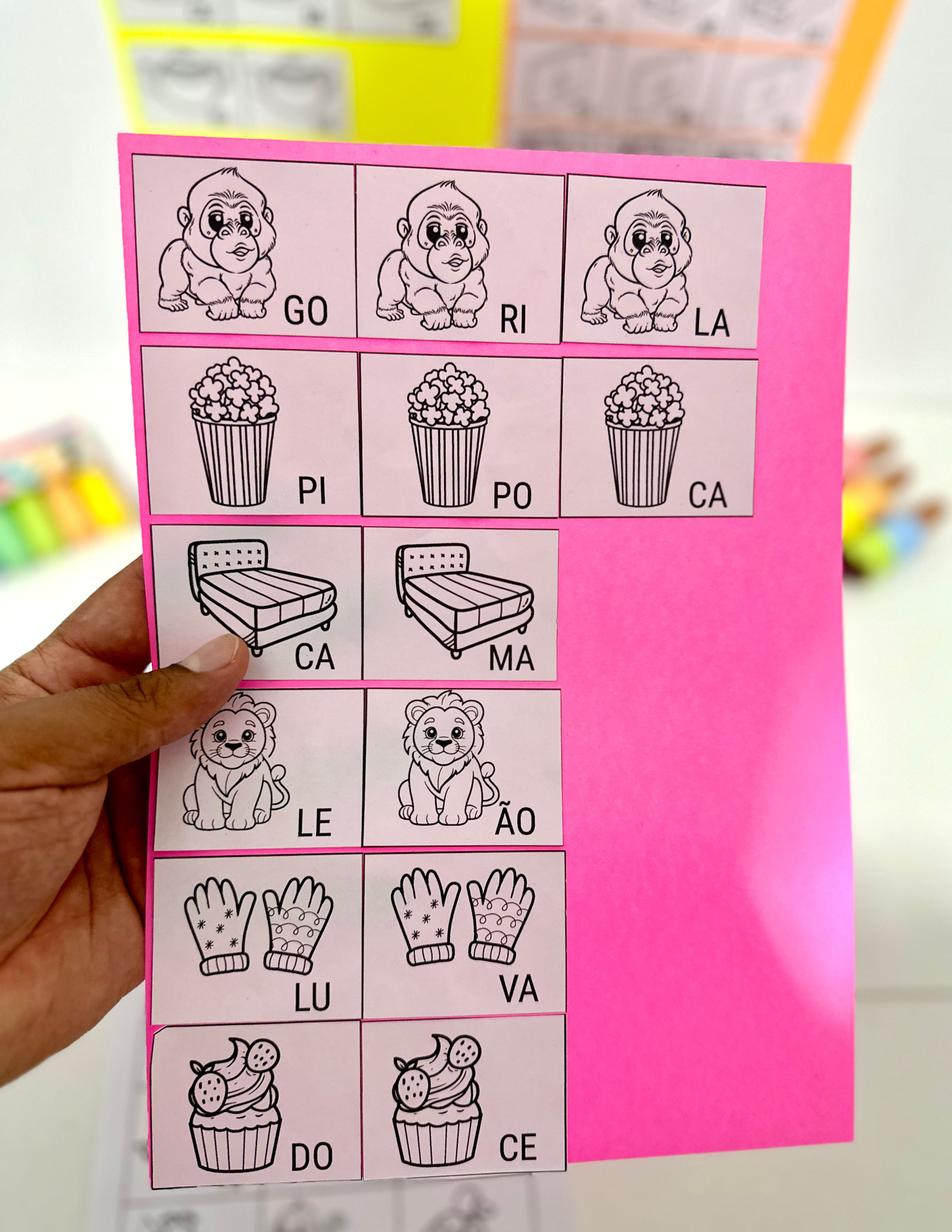 A criança deverá identificar as sílabas das palavras e colar, organizando a sequência corretamente.