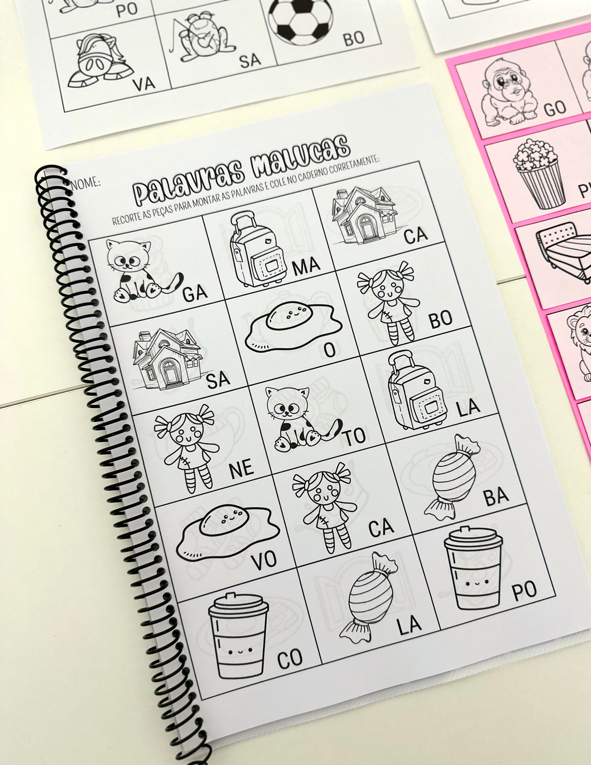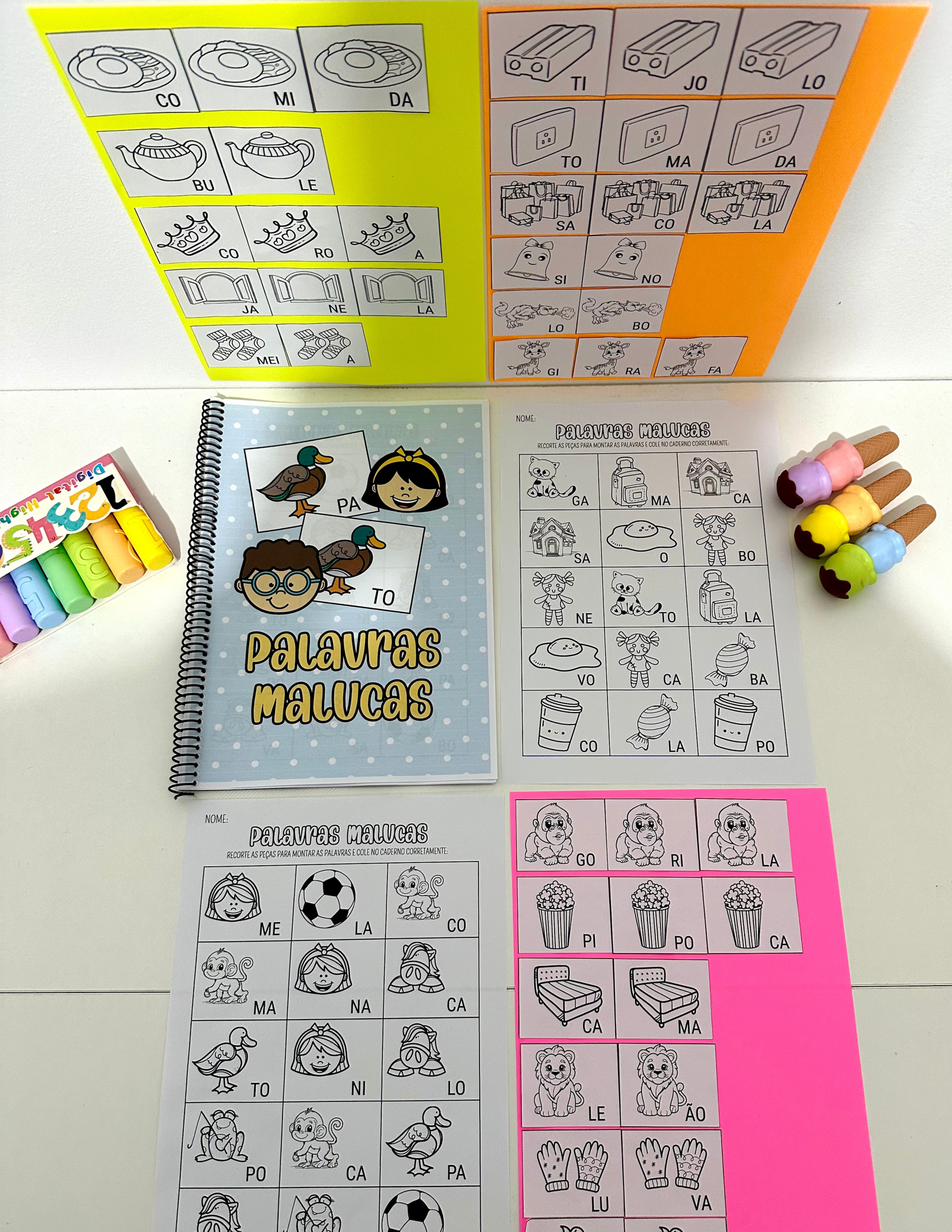 Apostila Palavras Malucas – Sílabas Simples com 16 páginas de atividades para colorir para trabalhar leitura de sílabas e escrita de palavras com crianças em fase de Alfabetização.