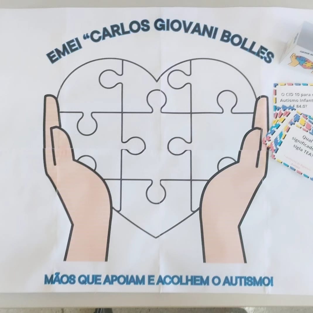 🌈 Um cartaz para fazer junto com os professores com 8 páginas com as frases “Nossa escola tem…” “Mãos que acolhem e apoiam o autismo”